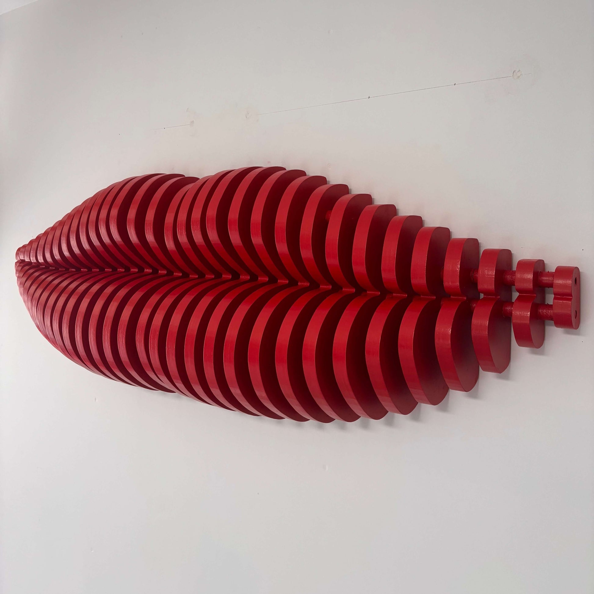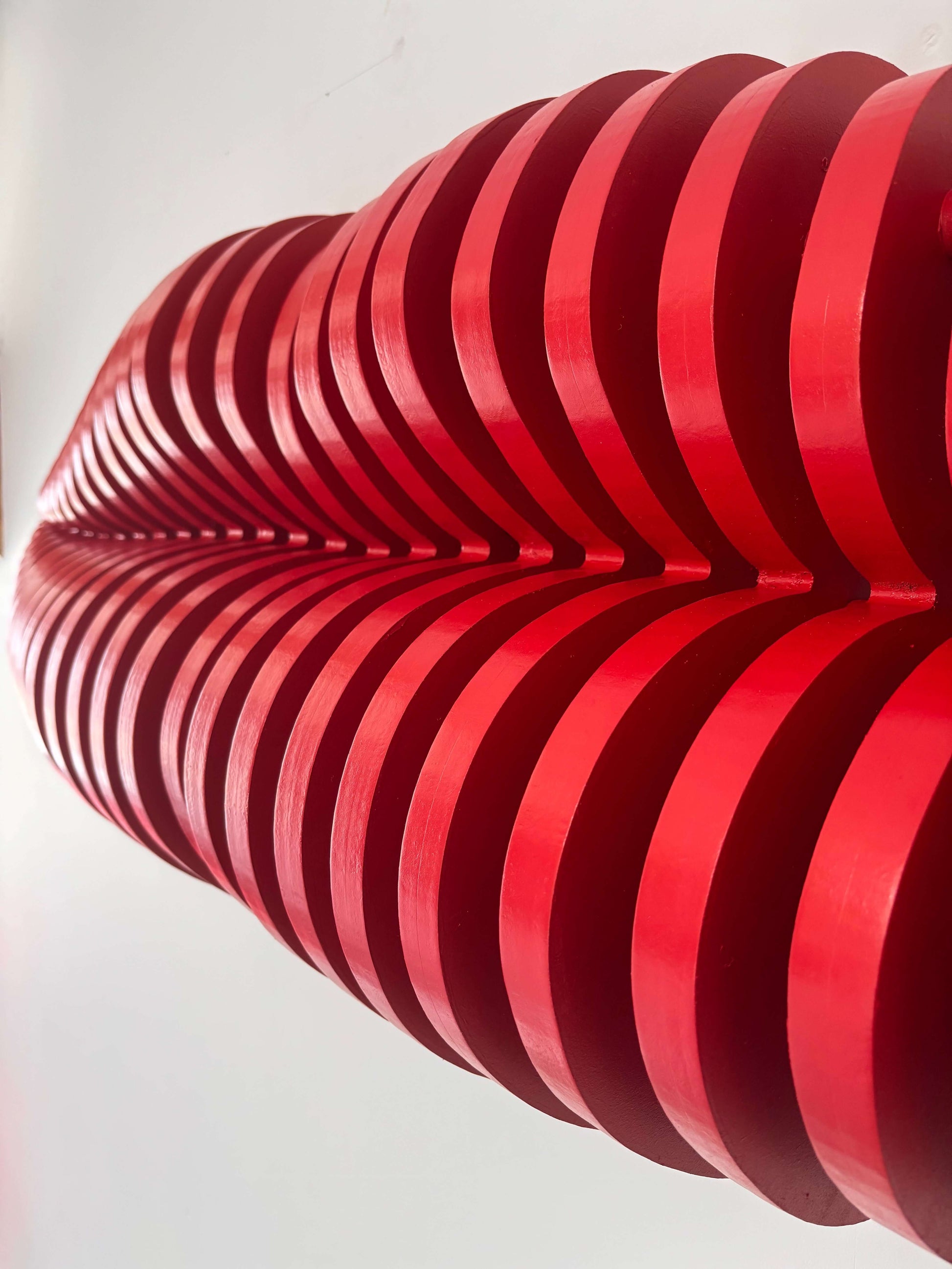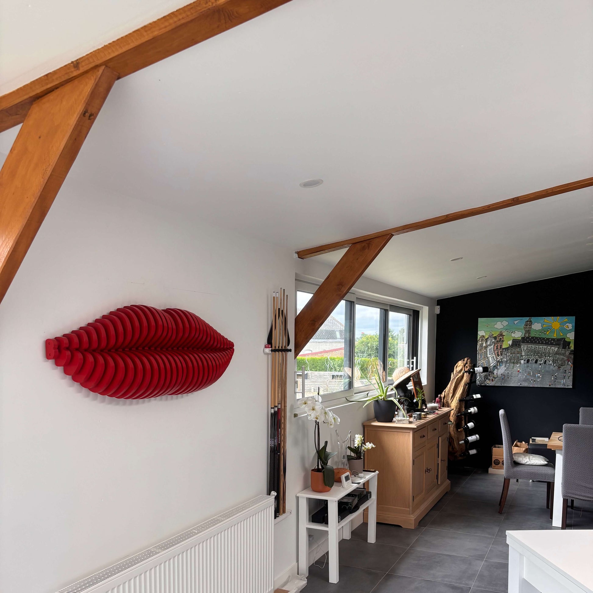 D'une largeur de 60cm, cette pièce impose sa présence sans jamais alourdir l’espace. Chaque lame de bois a été minutieusement découpée, positionnée et peinte en rouge vif pour accentuer le contraste entre le volume et la légèreté. L'effet 3D attire immédiatement le regard et donne à l'œuvre une dimension contemporaine et expressive.